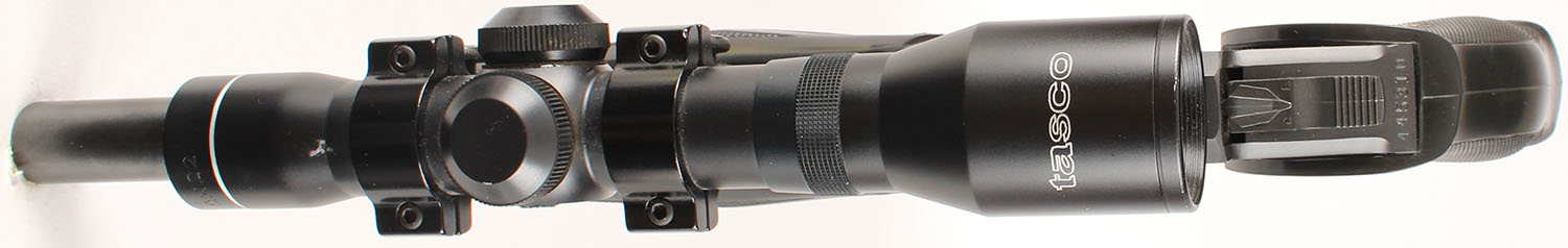 Thompson Center Arms, Contender Custom, CAL: 32 S&W Long, MFG: Modern, SN: 445310, Break Action Single Shot Pistol, 11'' barrel. The Pachmayr checkered rubber grip & forend are excellent. The original metal blue finish on the frame rates 99% & the upgraded blued Bulberry barrel rates 98%. Bore is excellent. The pistol holds a Tasco 2x22 fixed power scope. Barrel is tapped & drilled for a rear sight, with two filled screw holes. FFL Req. - Value: 250 to 400