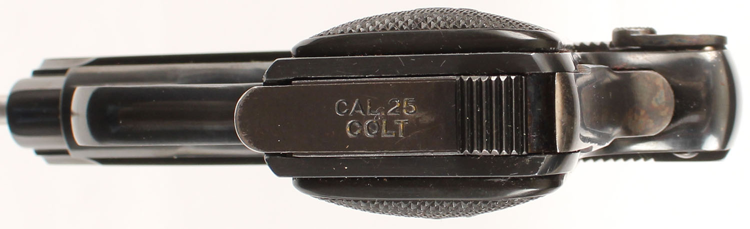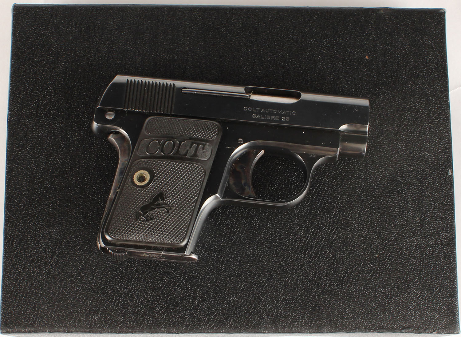 Colt, Model 1908, CAL: 25, MFG: 1920, SN: 275299, Semi Auto Pistol, 2'' barrel. The Colt marked & Rampant Colt checkered plastic grips are excellent. The metal blue finish rates 97% overall. The case-hardened trigger, grip safety & slide stop all retain vivid case colors. Bore is excellent. Groove sights. Comes in non-factory box, with Colt copied labels taped to the inside. FFL or C&R Req. - Value: 600 to 900