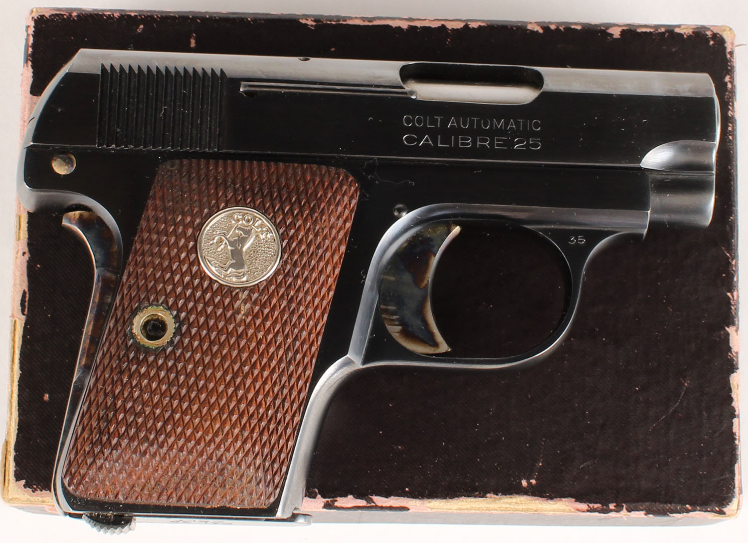 BOXED, Colt, Model 1908 Automatic Pocket, CAL: 25, MFG: 1928, SN: 370207, Semi Auto Pistol, 2'' barrel. The Colt logo medallion checkered wood grips are excellent. The original metal blue finish rates 97% overall. The case-hardened trigger, grip safety & slide lock all retain vivid case-colors. Bore is excellent. Groove & blade sights. Comes in original SN matching box, with paperwork. FFL or C&R Req. - Value: 500 to 1000
