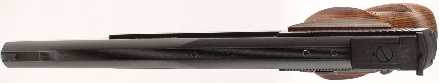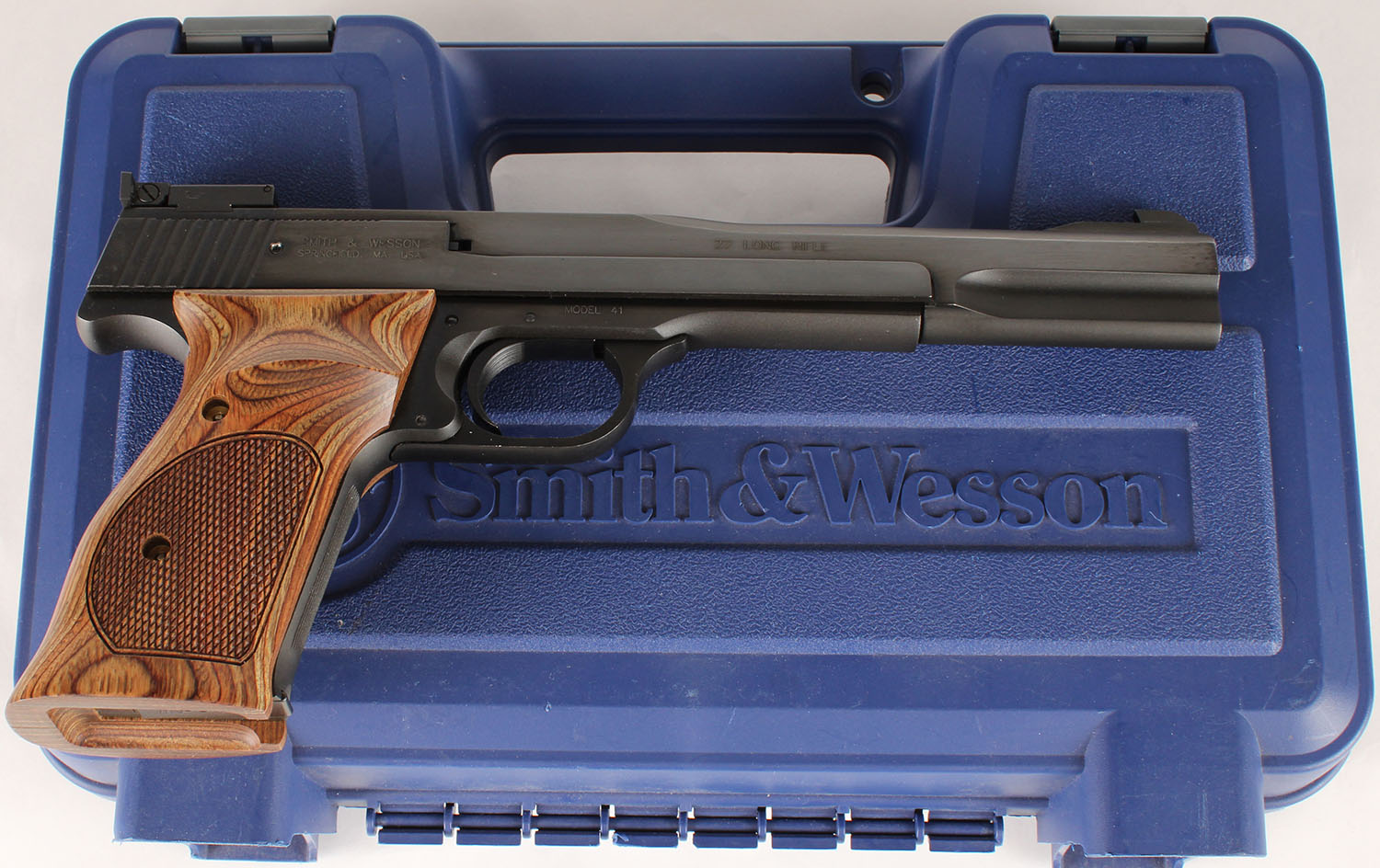 CASED, Smith & Wesson, Model 41, CAL: 22 LR, MFG: Modern, SN: DJY9943, Semi Auto Pistol, 7'' barrel. The laminated & checkered target grips are excellent. The metal blue finish rates 99%+ overall. Bore is excellent. Adjustable rear target sight & ramp elevated blade front sight. Comes in original blue hard case, with extra mag, related paperwork & lock. FFL Req. - Value: 1000 to 1300