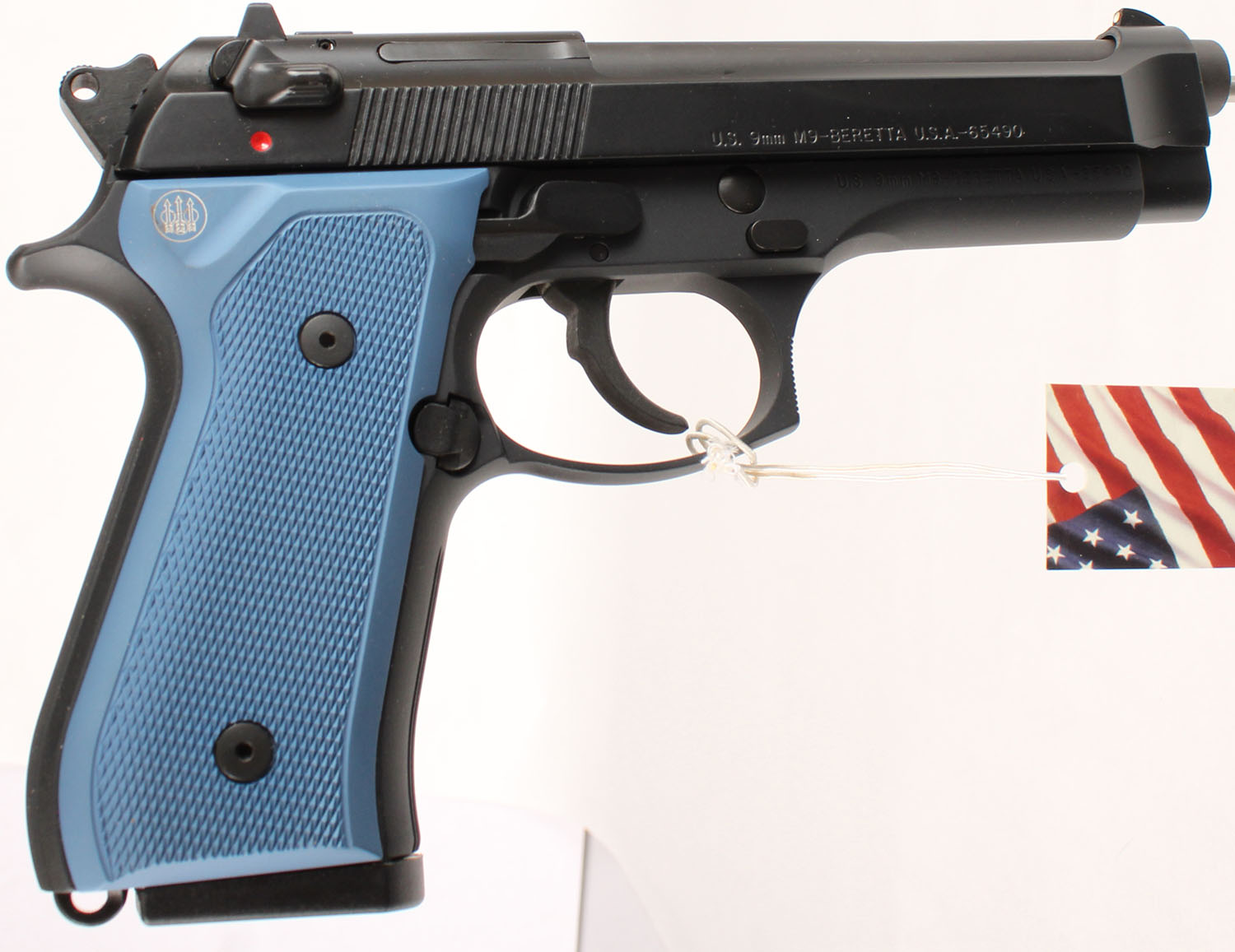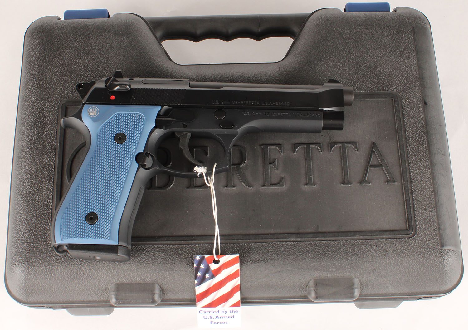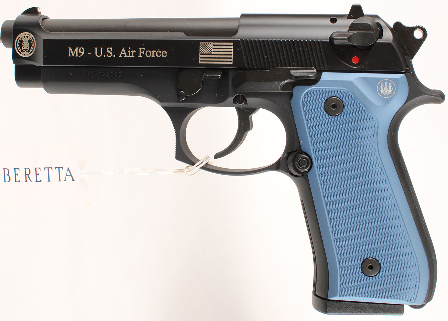 NEW CASED, Beretta, Model M9 U.S. AIR FORCE, CAL: 9mm, MFG: Modern, SN: M9-122532, Semi Auto Pistol, 4 3/4'' barrel. The factory blue aluminum grips are mint. The factory matte black finish is mint with US Flag & Air Force logo on left side of receiver, white dot rear sight & white dot front sight. Comes in factory hard case, with owners manual, brochure, extra black grips, & (3) 15rd mags. FFL Req - Value: 700 to 1000