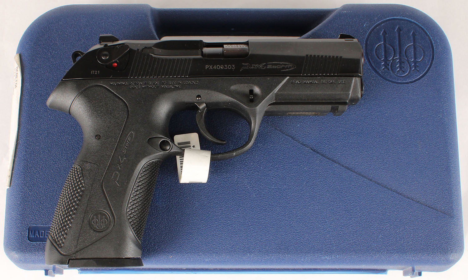 CASED, Beretta, Model PX4 Storm, CAL: 9mm, MFG: Modern, SN: PX409303, Semi Auto Pistol 3 7/8'' barrel. The checkered polymer grip frame is excellent. The original matte black finish on the slide rates 99%+. Bore is excellent. Factory contrast sights. Comes in factory hard case, with related paperwork, cleaning kit, lock, extra mag, speed loader & extra grip panels. NIB. FFL Req. - Value: 400 to 600