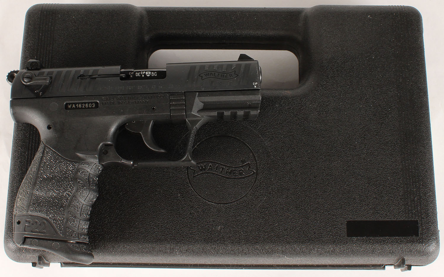 CASED Walther, P22 CA (California Compliant), CAL: 22 LR, MFG: Modern, SN: WA162603, Semi Auto Pistol, 3 3/8'' barrel. The textured polymer grip frame is excellent. The metal blue finish on the slide rates 98%. There is minor wear on the top of the chamber. Bore is excellent. The slide holds a dual white dot rear sight & single white dot blade front sight. Comes in original hard case, with (1) additional mag, speed loader & owners manual. FFL Req. - Value: 200 to 400