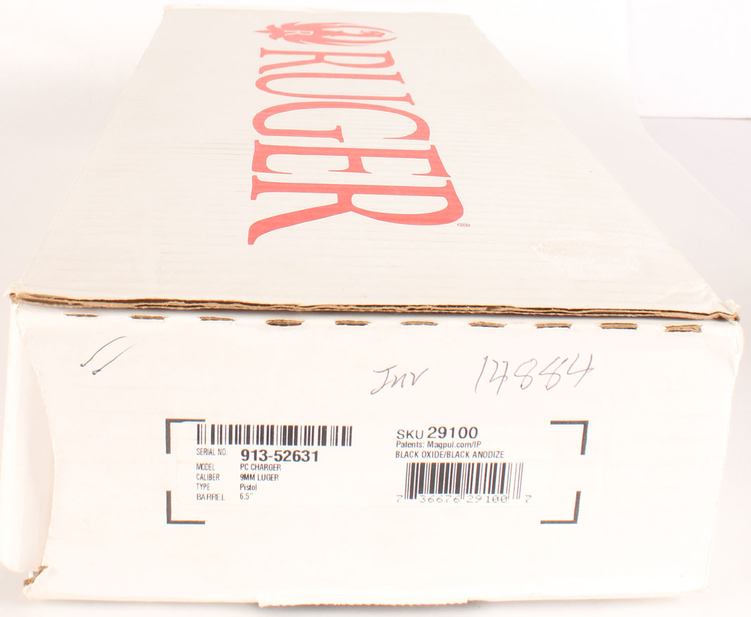 NEW, BOXED, Ruger PC Charger, CAL: 9mm, MFG: Modern, SN: 913-52631, Semi Auto Pistol, 6 1/2'' barrel The grooved polymer grip frame is excellent. The factory matte black finish rates 99%+ overall. Bore is mint. Factory sights. Comes in factory box, with owners manual, extra mag, speed loader & lock. Box condition is excellent, with minor shelf wear. FFL Req. - Value: 500 to 800