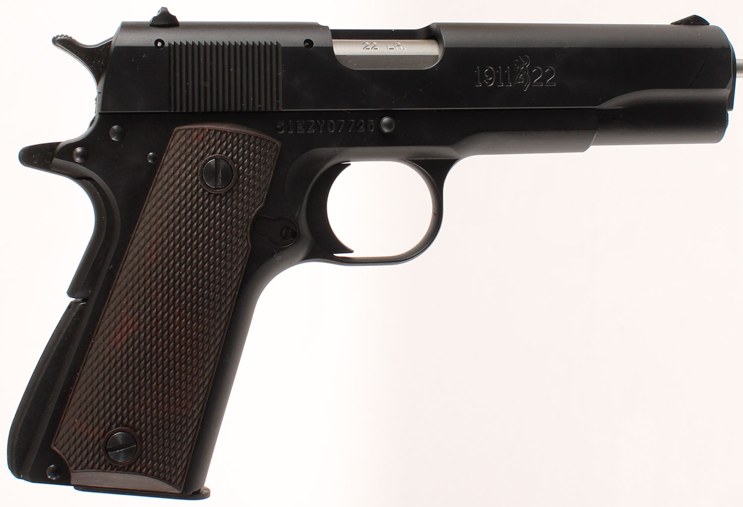 BOXED, Browning, 1911-22 A1, 1911-2011 100 years Edition, CAL: 22LR, MFG: Modern (2011), SN: 51EZY07726, Semi Auto Pistol, 4 1/4'' barrel. The checkered plastic grips are excellent. The factory matte finish on the frame & slide rates 99%+ overall. Bore is excellent. Factory fixed sights. Comes in Browning 100 Years cloth case with leather accents & outer cardboard sleeve. Included is related paperwork, test fire cartridge & lock. In honor of the 100th anniversary of a great firearm, Browning came out with a scaled-down version in .22 Long Rifle, the 1911-22 A1. NOS. FFL Req. - Value: 400 to 600