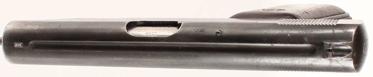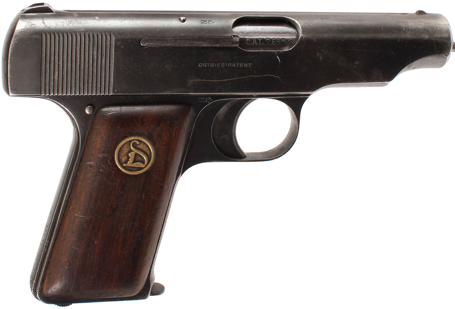 Deutsche Werke, Ortgies Patent, CAL: 7.65 (32 Auto), MFG: 1919-24, SN: 91731, Semi-Auto Pistol, 3 3/8'' barrel. The left side of the slide is marked ''DEUTSCHE-WERKE (LOGO) WERK EFURT'', the right side is marked ''ORTGIE'S PATENT'' & the frame, on the underside of the barrel is marked with the full SN, over ''GERMANY''. The logo brass medallion wood grips are excellent & solid, with scrapes & dings to the finish. The metal blue finish rates 75% overall, with a thin brown patina, areas of pitting & the muzzle has worn to metal gray. Bore is very good, with strong rifling & consistent roughness. The slide holds a fixed small notch rear sight & small blade front sight. FFL or C&R Req. - Value: 100 to 250
