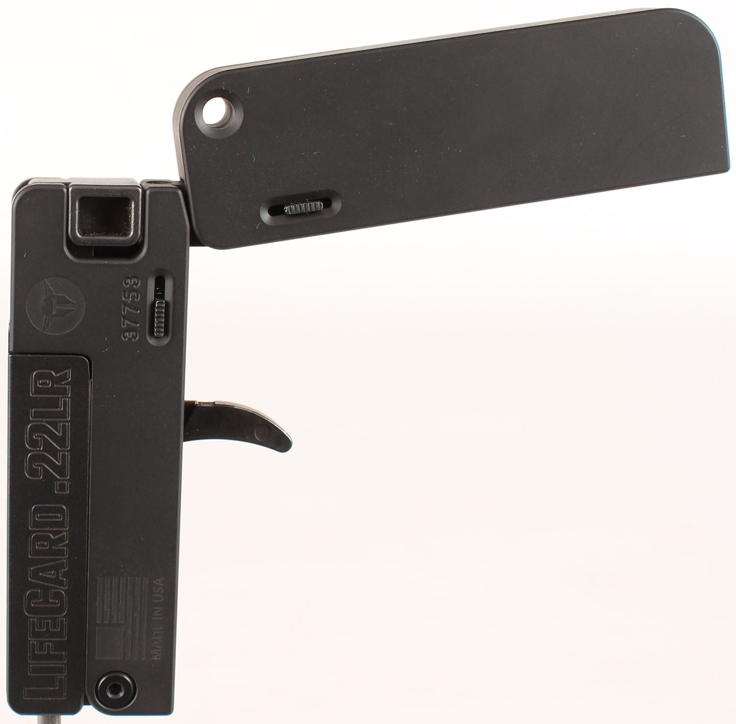 BOXED, Trailblazer Firearms, Lifecard, CAL: 22LR, MFG: Modern, SN: 37753, Single Shot Pistol, 2 3/8'' barrel. The grip folds out from the bottom. The corrosion resistant matte black finish rates 99%+ overall. Bore is excellent. Integral groove sight. From Trailblazer Firearms: A folding, single-shot .22 caliber pistol that is no bigger than a stack of credit cards. At .5 inches thin and weighing less than 7 ounces, LifeCard will be the last gun you'll leave behind. NOS. FFL Req. - Value: 200 to 400