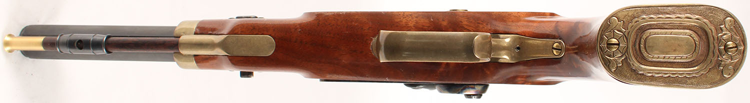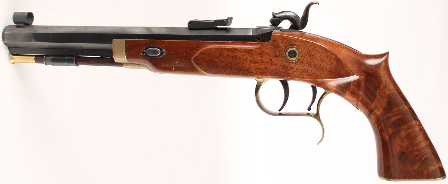 Thompson Center Arms, Patriot Target Pistol, CAL: 45, MFG: Modern, SN: 20208, Percussion Muzzleloader Pistol, 9'' octagon barrel. The ergonomic wood grip with integral beavertail is excellent. There are a few minor handling marks & dings to the finish. The metal blue finish on the barrel rates 95%. The case-hardened side plate retains vivid case-colors. Brass furniture is excellent. Bore is excellent. Factory target sights. Double set trigger. Ramrod present. Blackpowder, No FFL Req. - Value: 400 to 600