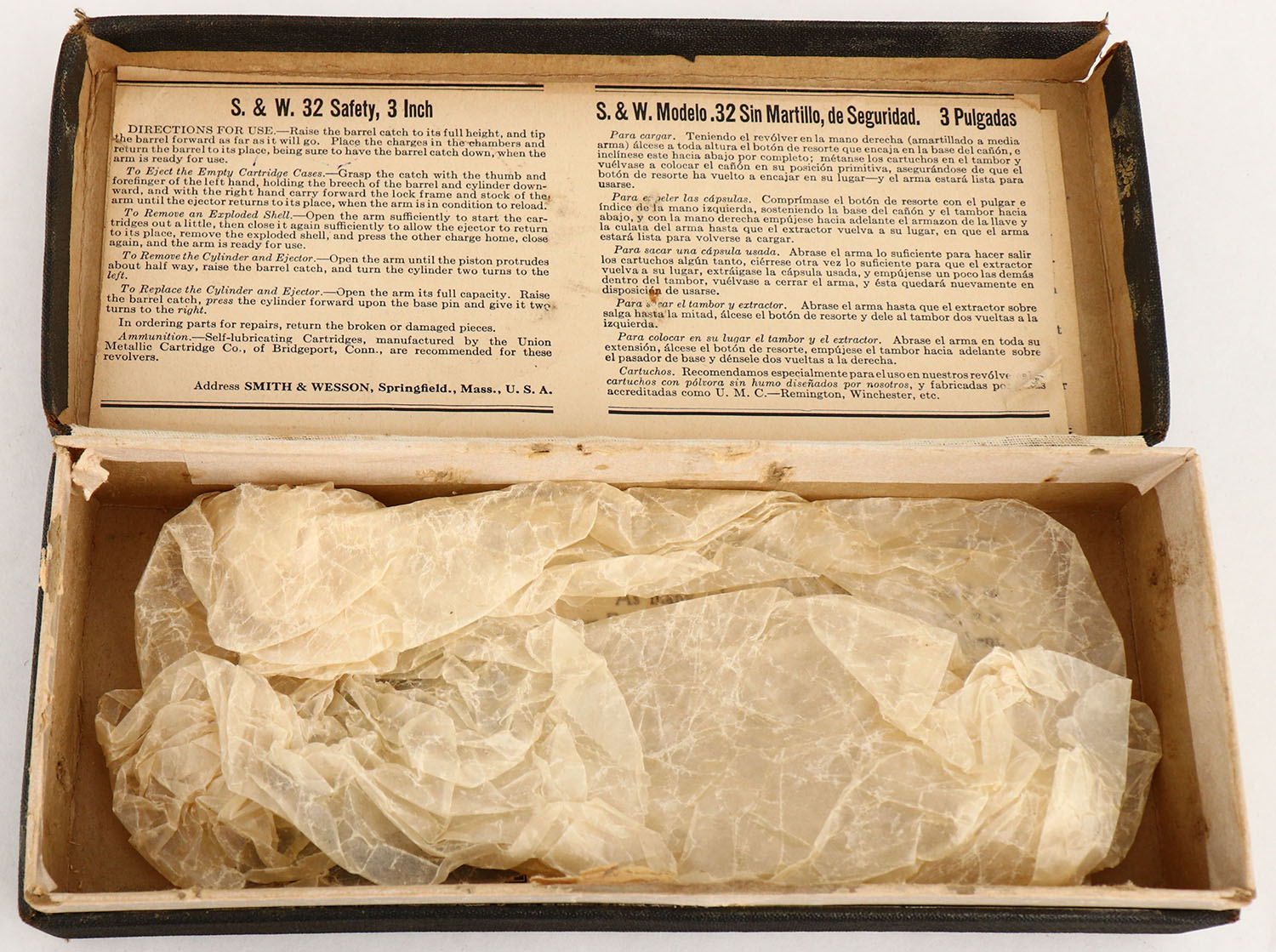 BOX ONLY: S&W Model New .32 Departure Safety Nickel 3 inch. Has original end label, inner lables & tissue. Box condition is very good. - Value: 20 to 100