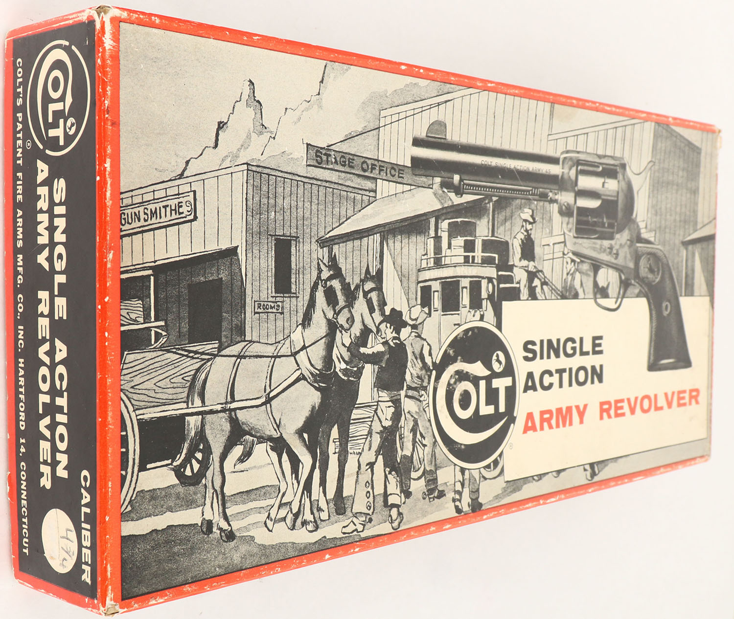 BOX ONLY: Colt Model Single Action Army Revolver Picture two piece box. Was originally for 357, 4 3/4''. The inside has original cutout picture storage packaging. Box condition is excellent. - Value: 20 to 100