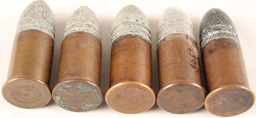 Lot of 5. 56-56 Spencer Navy & Infantry. NHS. Copper Case-CL: approx. .88''. PT Lead w/ 2 visible bands. Grade: Very Good + - Value: 40 to 60