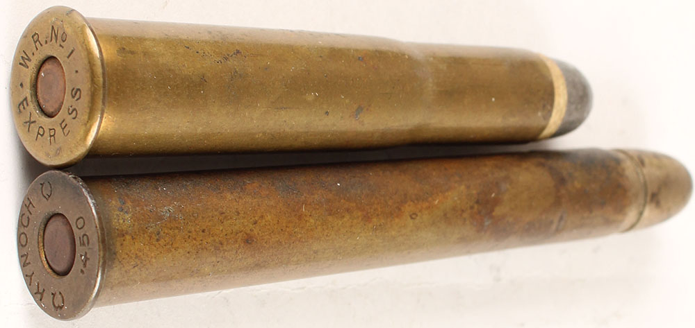 Lot of 2. (1) .450 x 3.25'' Nitro. HS:''KYNOCH C .450 C'', RN CN FMJ w/ one visible cannelure above the case mouth. (1) 500/450 #1 Express. HS:''W.R. No 1 . EXPRESS .'', RN PP Lead. Grade: Very Good - Value: 20 to 40
