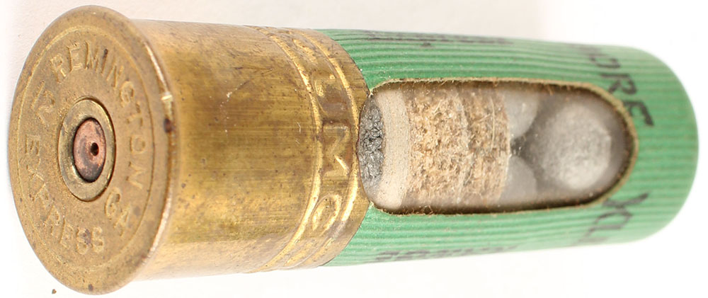 H/S= ''Remington Express 12ga'' 2 1/2'' OAL, window shell, salesman sample in green paper case. Grade: Excellent - Value: 6 to 50