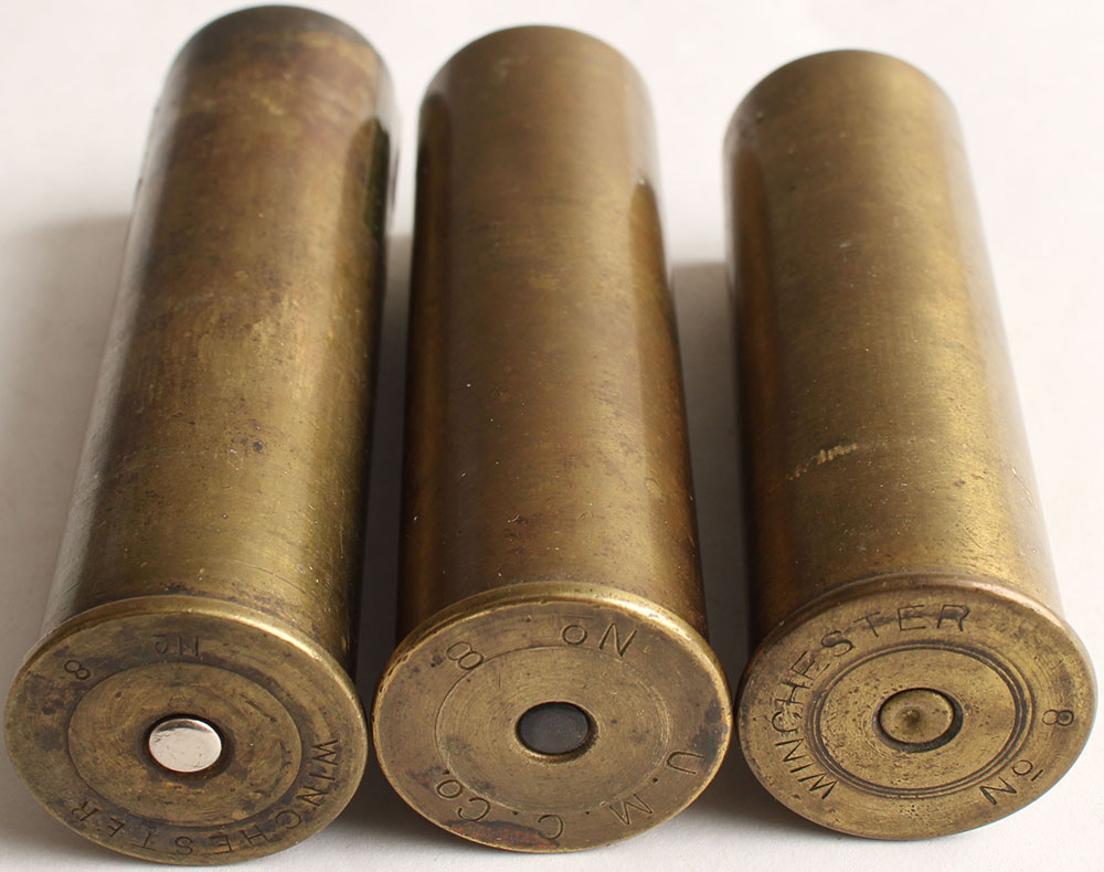 Lot of 3 mixed H/S, 8 gauge, empty brass shotshells. Grade: Very Good - Value: 10 to 80