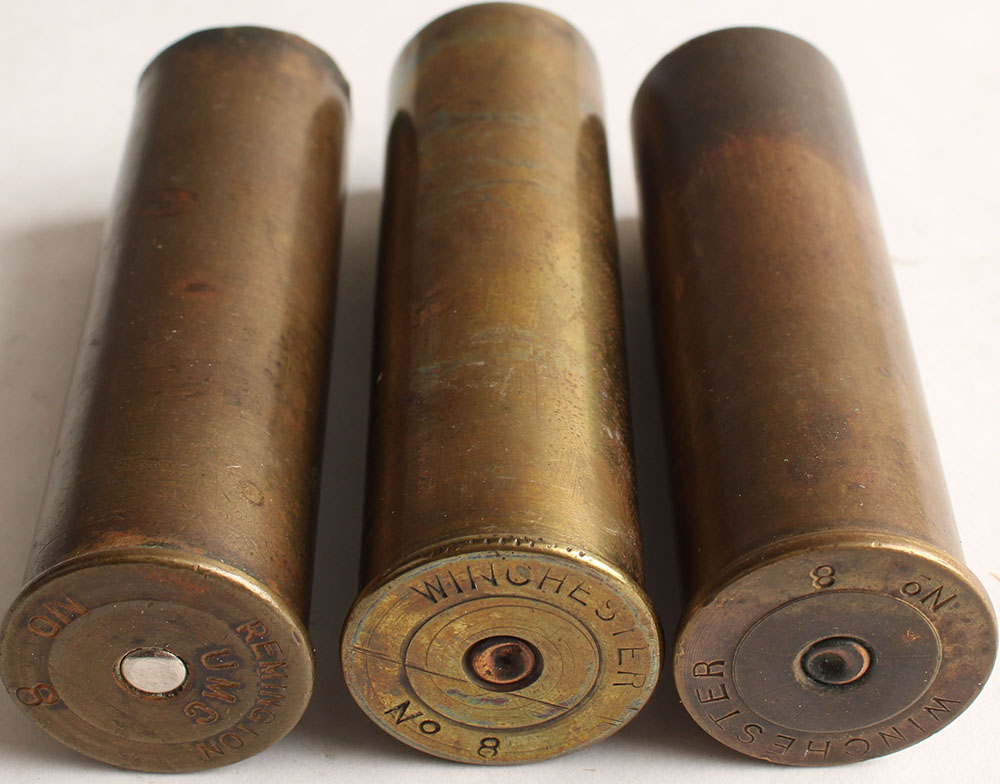 Lot of 3 mixed H/S, 8 gauge, empty brass shotshells. Grade: Very Good - Value: 10 to 80