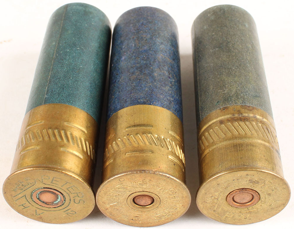 | Lot of 3 Peters H.V. 12ga, loaded blue paper cases. Grade: Very...