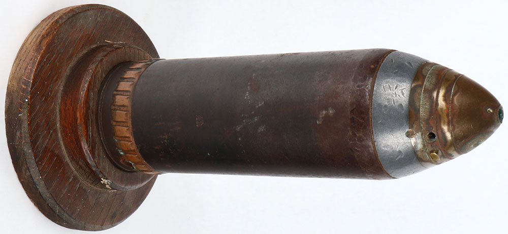 Tank projectile turned into trench art, projectile on wooden base. OAL: 11 3/4''. Grade: Very Good + - Value: 10 to 50