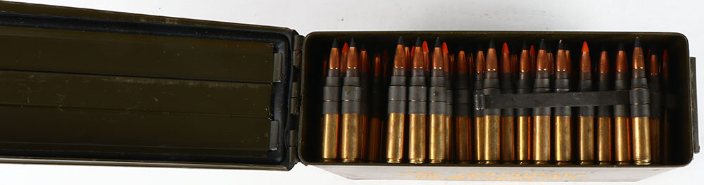 M19A1 ammo can filles with 250 Rds. Of linked Surplus 30-06, ammo is linked 4 Rds. of Black tip AP & 1 Rd of orange tip tracer, this is the original can for this ammo, ammo is excellent. Grade: Excellent + - Value: 250 to 500