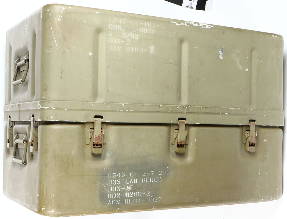 US, Large Metal storage box, box is 31 1/4'' x 21 1/2'' x 19 1/4'', inside is clean with no rust, top half is marked in paint ''6545-01-182-3806'', ''DMS, HOSP DENTAL'', ''A 2/92'', ''BOX-3'', ''BDN 81HJ-8'', bottom half is marked in paint ''6545 01 247 2969'', ''MMS LAB BLOOD'', ''BOX-15'', ''BDN 828D-2'', ''CAN BLBA-3025''. Container is very large but light, made of aluminum, will likely be expensive to ship. Grade: Excellent - Value: 50 to 100