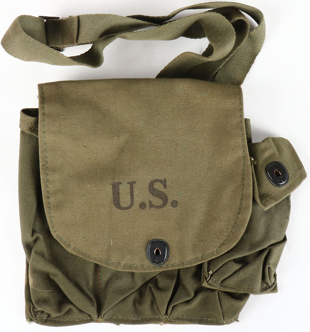 US, WW2 Military magazine pouch, has 3 bigger mag pouched & one smaller pouch off to the side, marked ''U.S.'' on the front of flat, back of flap is marked ''SHANE MFG. CO.'', ''1944''. Grade: Excellent - Value: 20 to 60
