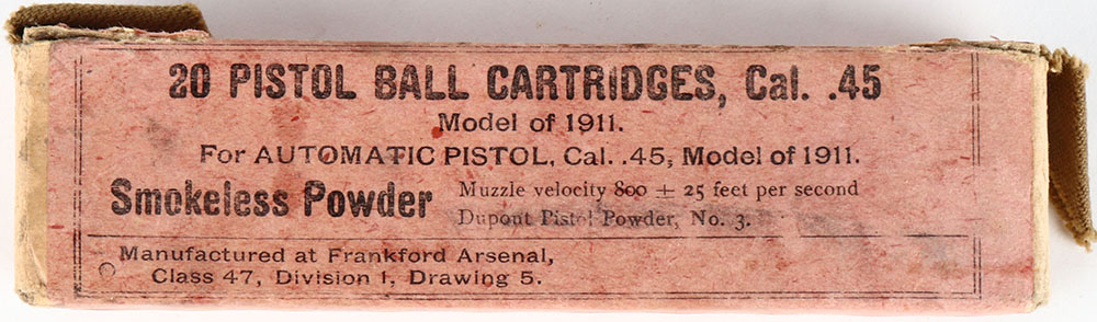 Frankford Arsenal, Cal. .45 M1911 Ball, dated June 2nd 1919, 1pc, FULL & SEALED, buff box with red label & black print, box is solid with age soiling, rub marks, & light stains. Grade: Very Good ++ - Value: 20 to 40