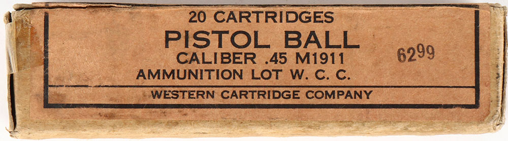 Western, .45 M1911 Ball, Lot 6299, 1pc, FULL & SEALED, buff box & label with black print, box is solid with age soiling, tape, handling wear & light rub wear. Grade: Very Good + - Value: 20 to 40