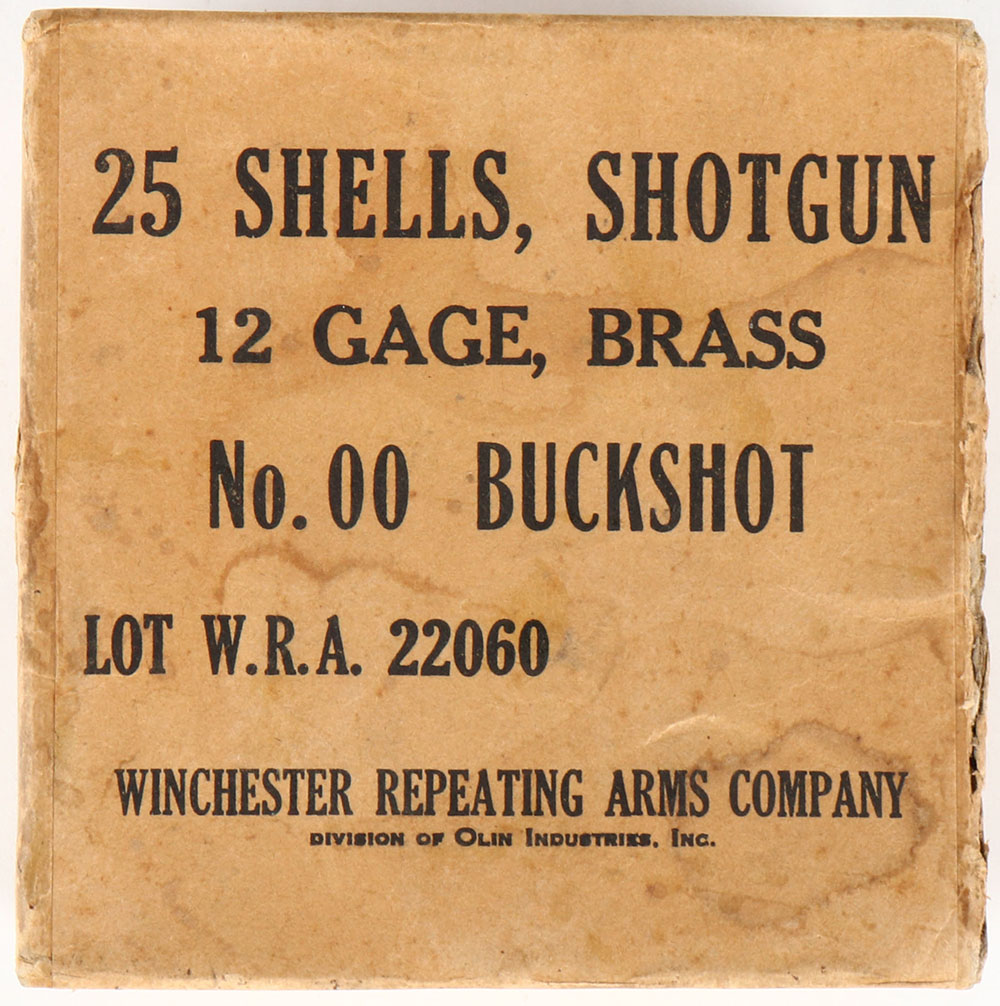 Winchester, 12 Ga, No. 00 Buckshot, Brass shell, Lot W.R.A. 22037, 2pc, empty, buff box with black print, box is solid with stains, tape on bottom, edge wear & rub marks. Grade: Very Good ++ - Value: 40 to 120
