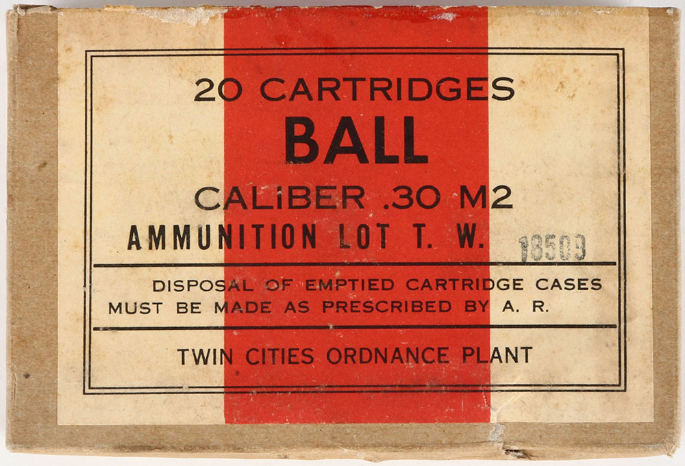 Twin Cities, .30 M2 Ball, Lot T.W. 18509, 1pc, Full, brown box with buff/red label &^ black print, box has small tears in bottom, light age soiling, rub marks & light edge wear, ammo is very good. Grade: Very Good + - Value: 20 to 40
