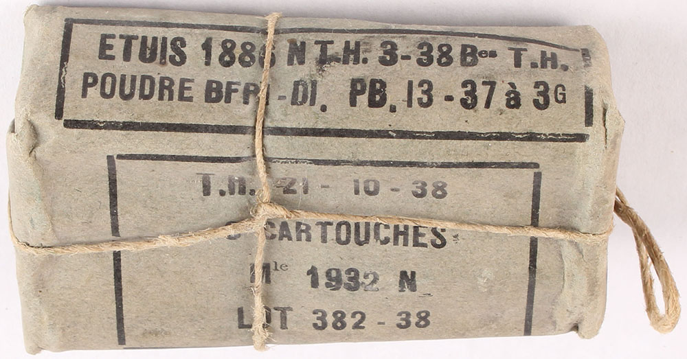 French, 8x50mm Lebel Mle 1932 N (Ball N), dated 1938, not to be fired from French guns not marked ''N'' above chamber, packet, FULL & SEALED, blue packet with black print, packet is sold with light stains & handling wear. Grade: Excellent - Value: 10 to 30