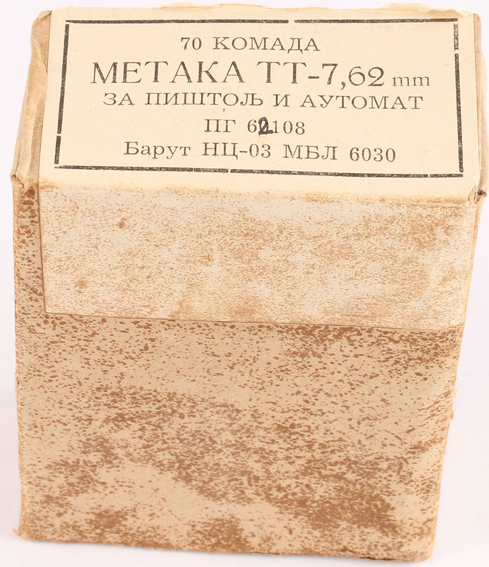 Yugo, 7.62x25mm Tokarev, dated 1962, 70 Rd. box, 1pc, Full, buff box & label with black print, box is solid with shelf stains on bottom, & light rub wear, ammo is excellent. Grade: Excellent + - Value: 40 to 80