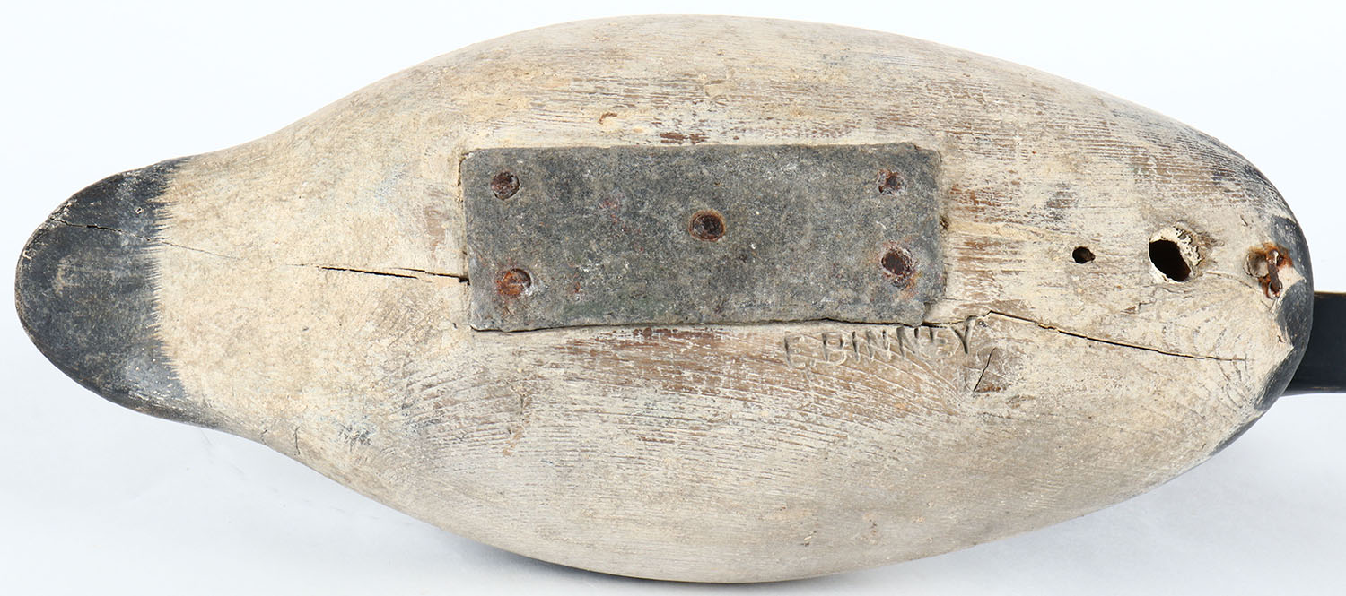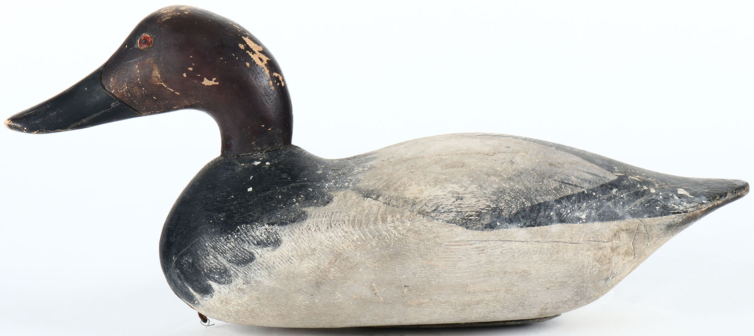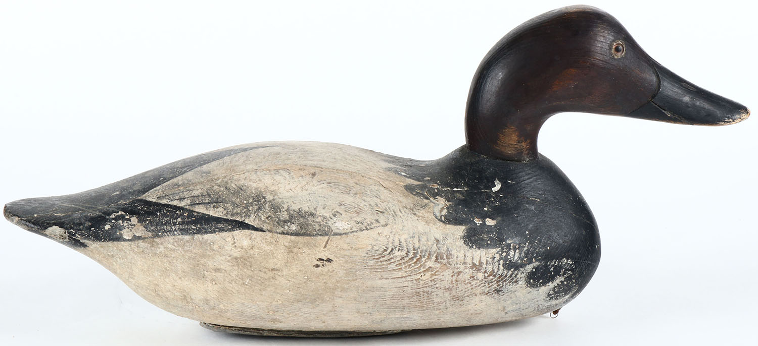 Challenge Canvasback Drake by Mason Decoy Company, Detroit, MI, 1896-1924 glass eyes, solid wood, restored paint with a head carved to replicate Mason, structurally excellent, branded E. BINNEY on bottom, has age cracks on back and bottom of body. Grade: Very Good + - Value: 60 to 120