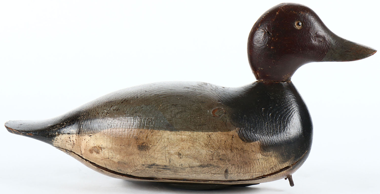 Late Standard Redhead Drake by Mason Decoy Company, Detroit, MI, 1896-1924. Glass eyes, solid wood, strong original paint with an original Mason weight, has age crack on bottom. Grade: Very Good - Value: 60 to 120