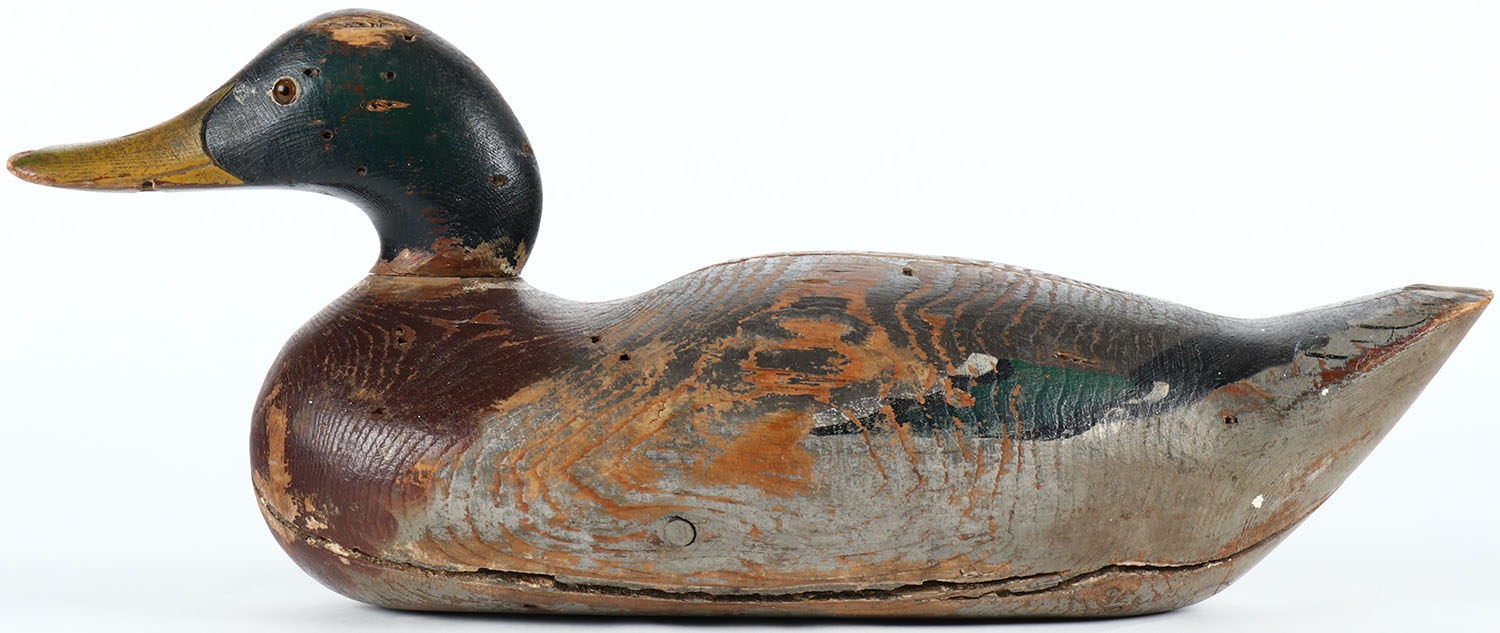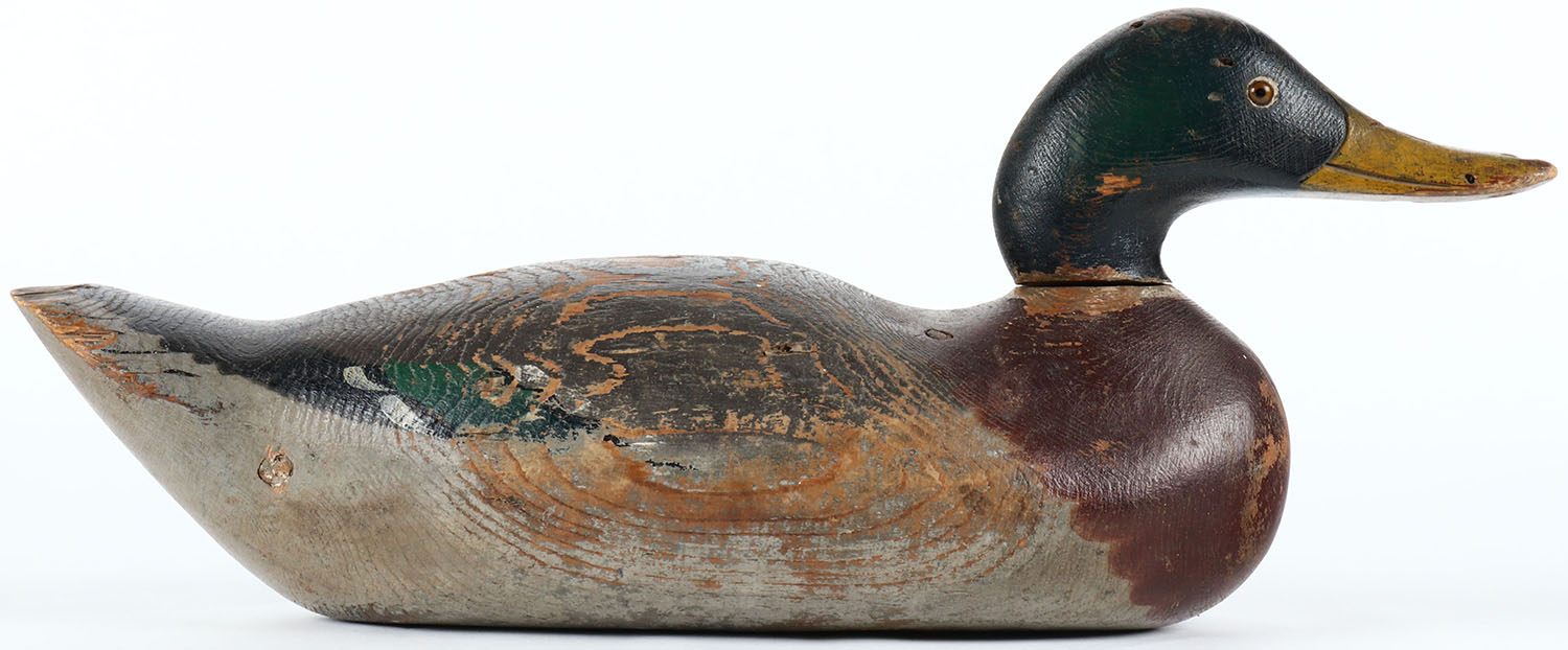 Challenge Mallard Drake by Mason Decoy Company, Detroit, MI, 1896-1924. Glass eyes, solid wood, vibrant original paint with wear, has age cracks on back and bottom of body, head moves from side to side. Grade: Very Good + - Value: 100 to 200