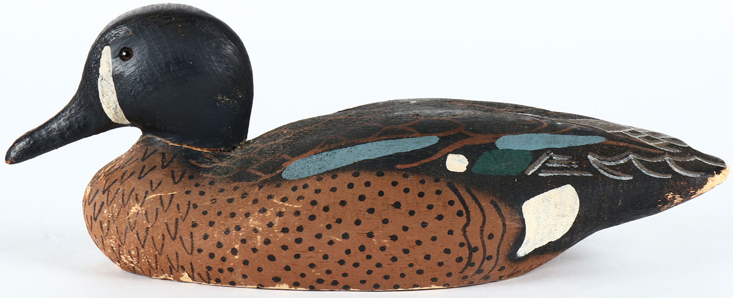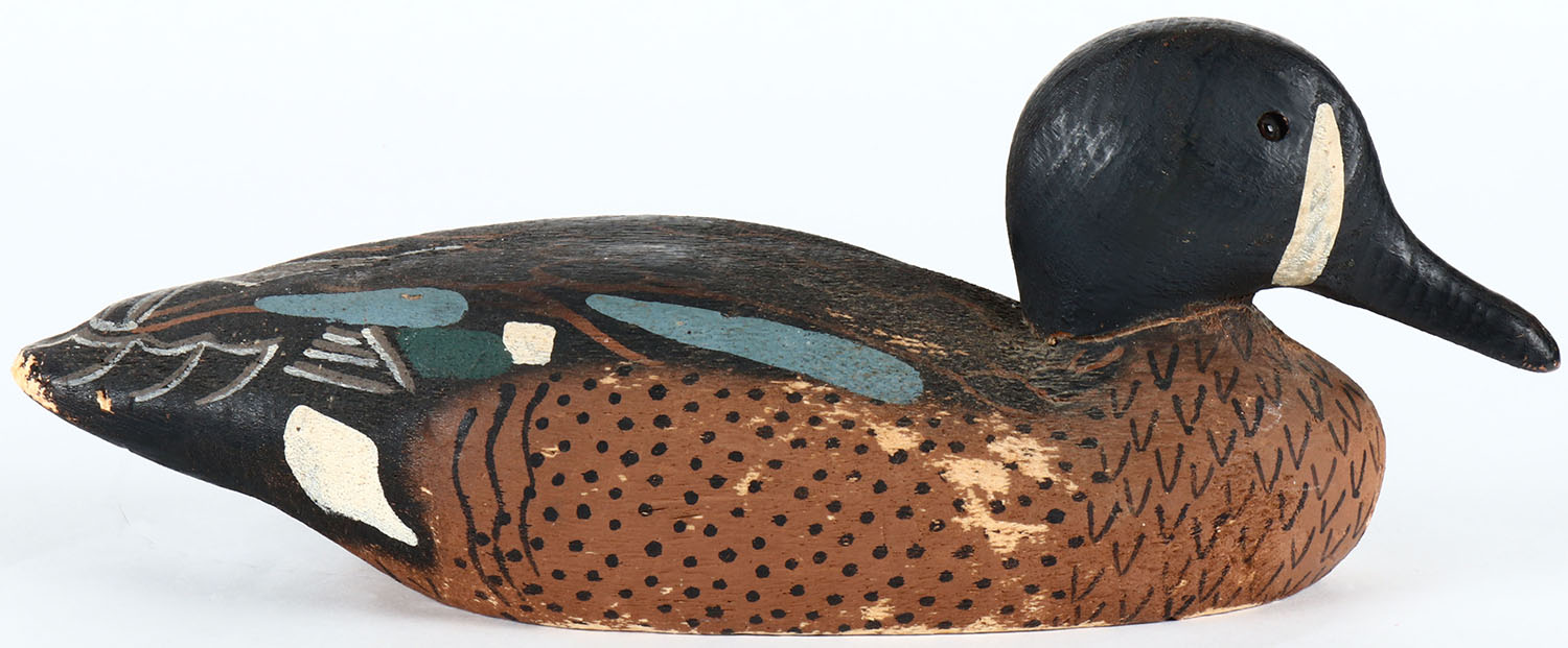 Blue Wing Teal Drake by Herter's Inc. glass eyes, solid balsa wood, original paint with typical wear, structurally excellent, branded by HERTERS INC. on bottom. Grade: Excellent - Value: 30 to 100