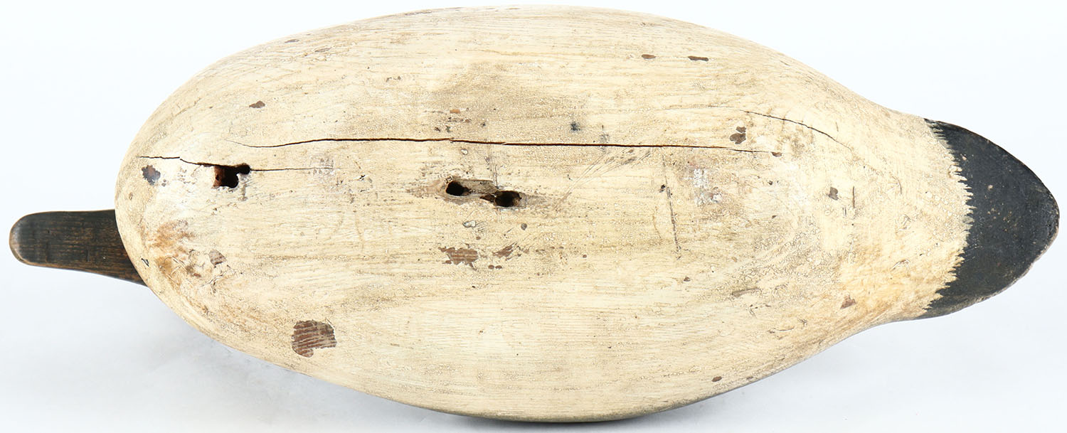 Challenge Pintail Drake by Mason Decoy Company, Detroit, MI, 1896-1924. Glass eyes, solid wood, complete paint restoration with a head not original to the body, age cracks on back and on bottom. Grade: Very Good - Value: 70 to 150