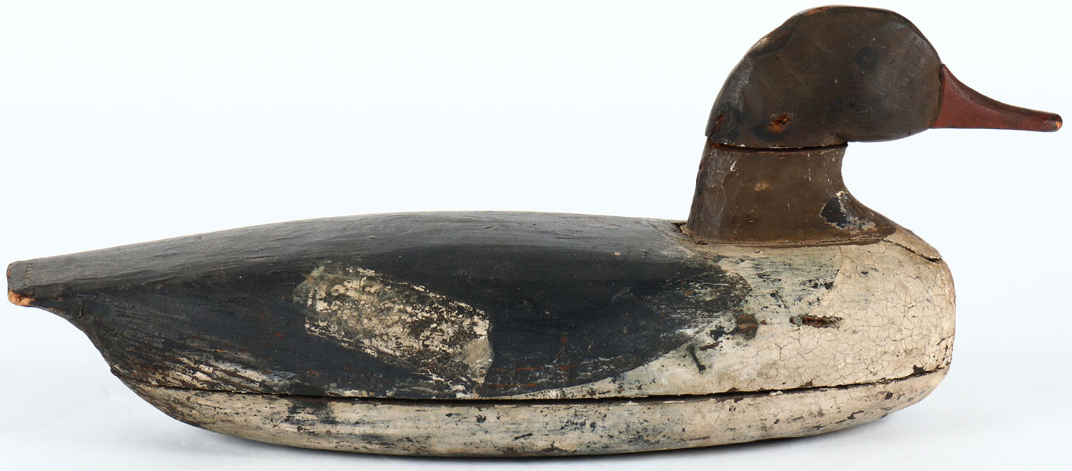 Merganser by unknown maker, painted eyes, solid wood, combination of some original paint and old working repaint, neck crack, body seam separation. Grade: Very Good - Value: 80 to 150