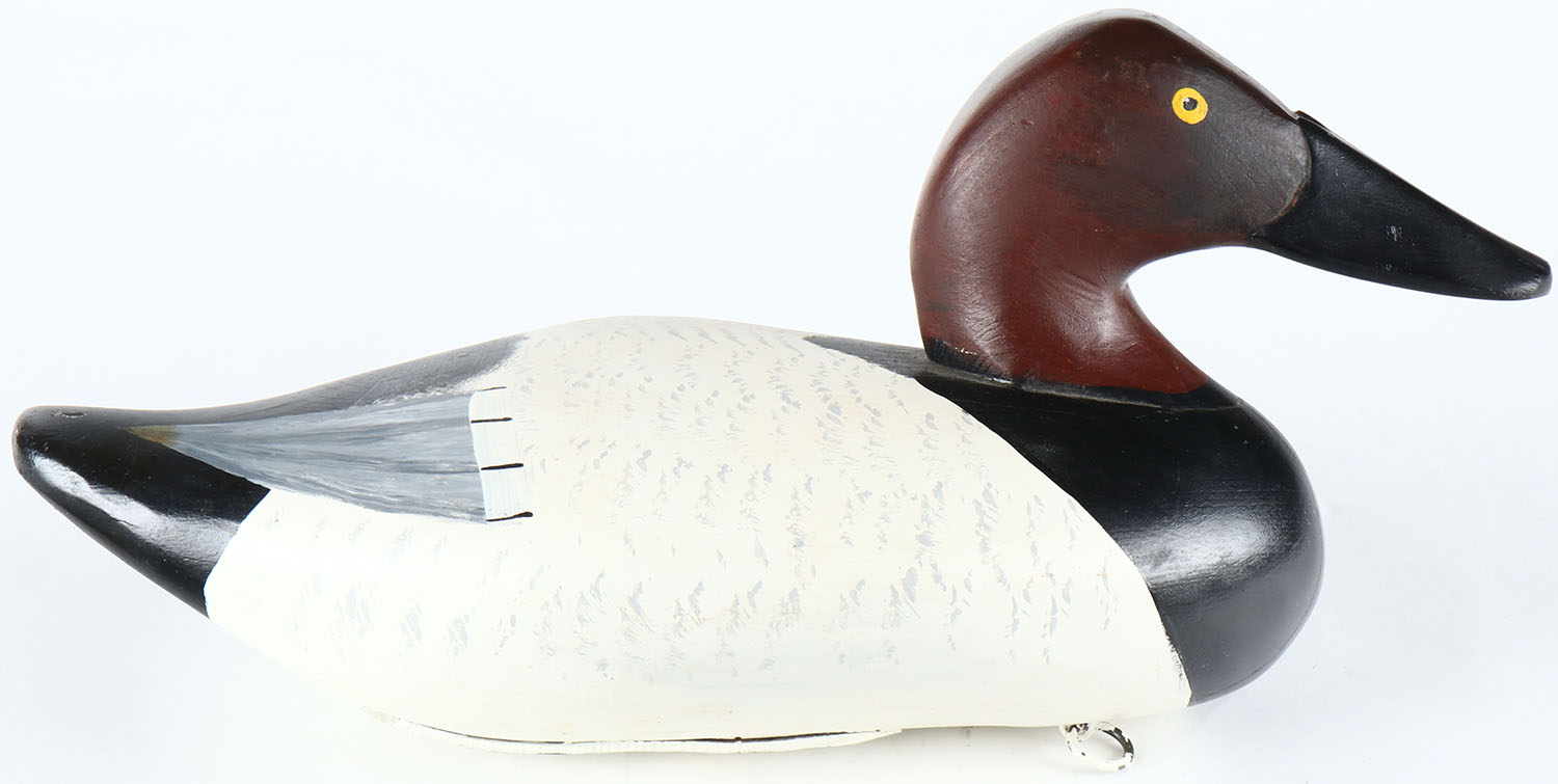Canvasback Drake by unknown Maryland maker, painted eyes, solid wood, original paint, structurally excellent, signed on bottom. Grade: Excellent - Value: 50 to 100