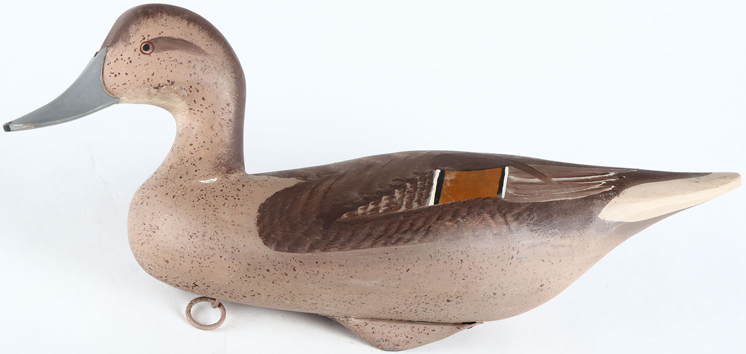 Pintail Hen by unknown Maryland maker - however signed on bottom under tie line, painted eyes, solid wood, original paint, structurally excellent. Grade: Excellent - Value: 70 to 150