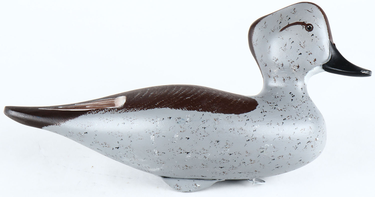 Oldsquaw Hen by ''Spencer'', painted eyes, solid wood, original paint, structurally excellent, branded SPENCER on bottom. Grade: Excellent - Value: 50 to 100