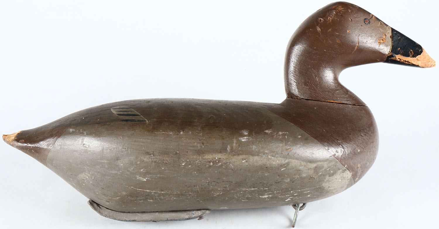Canvasback Hen by unknown Maryland maker, painted eyes, solid wood, original paint, has damage to the bill and wear to the tail. Grade: Good - Value: 50 to 100
