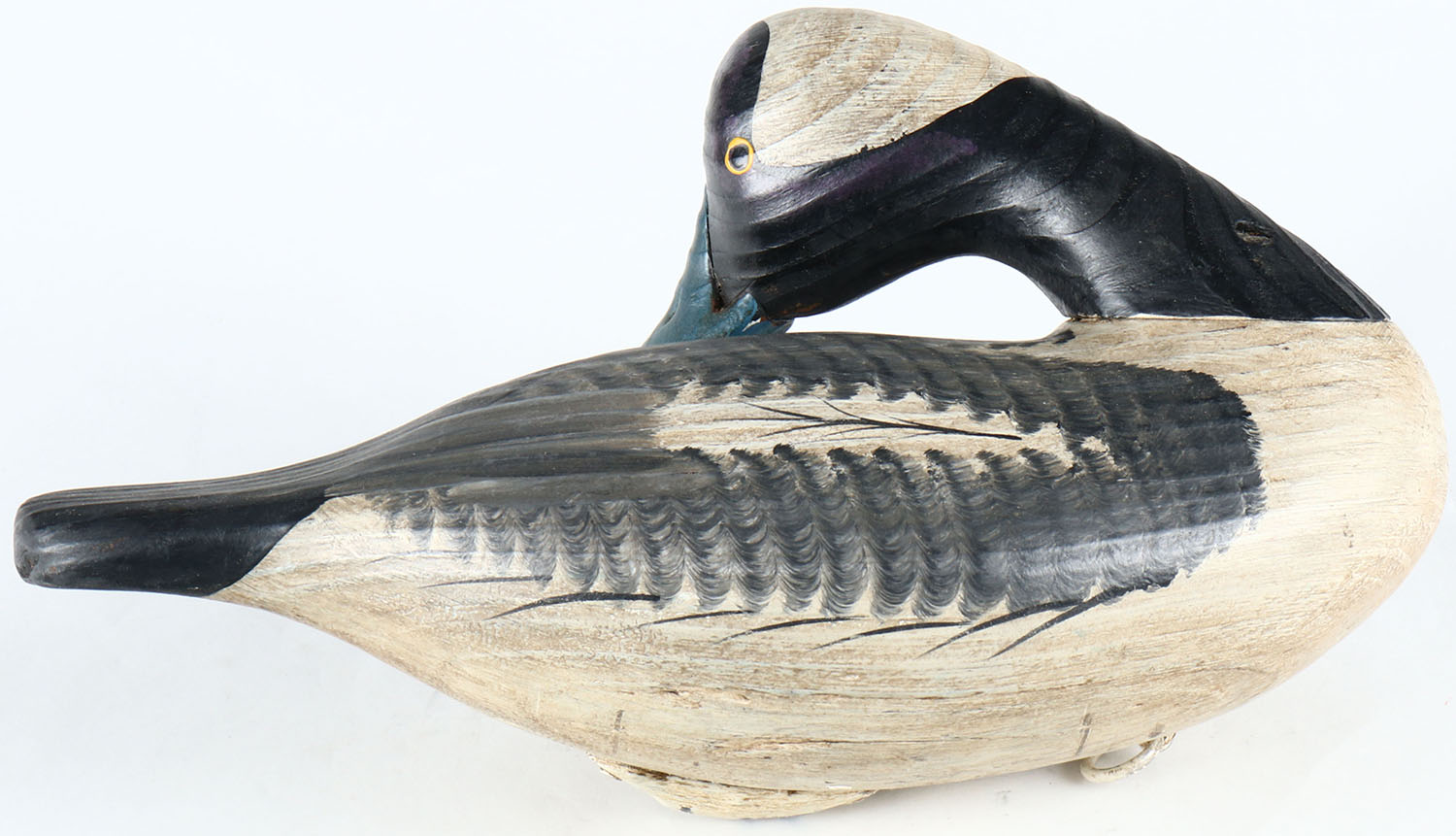 Preening Bufflehead Drake by Capt. Bryant, Perryville, MD, painted eyes, solid wood, original paint, structurally excellent, branded BRYANT on bottom. Grade: Excellent - Value: 50 to 100