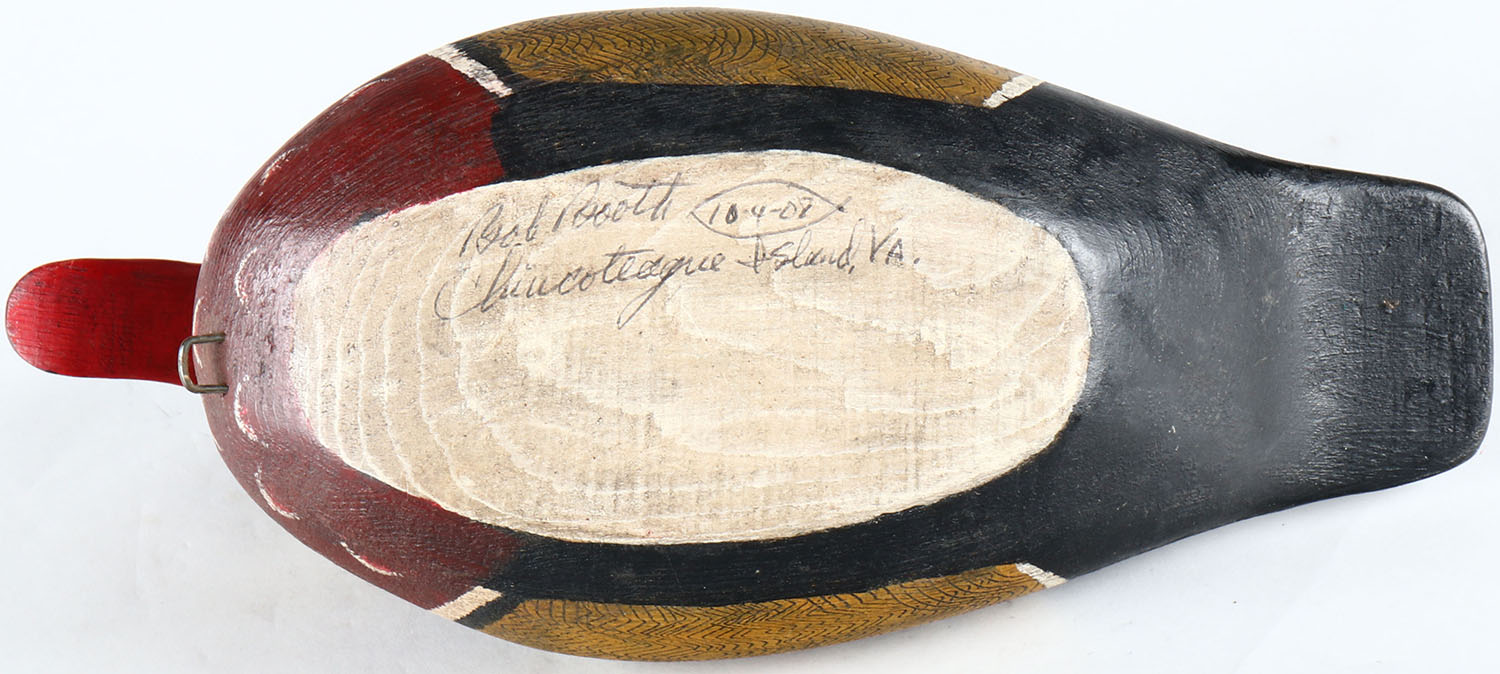 Woodduck Drake by Bob Booth, Chincoteague Island, VA. Painted eyes, hollow wood, original paint, structurally excellent, signed on bottom. Grade: Excellent - Value: 70 to 150