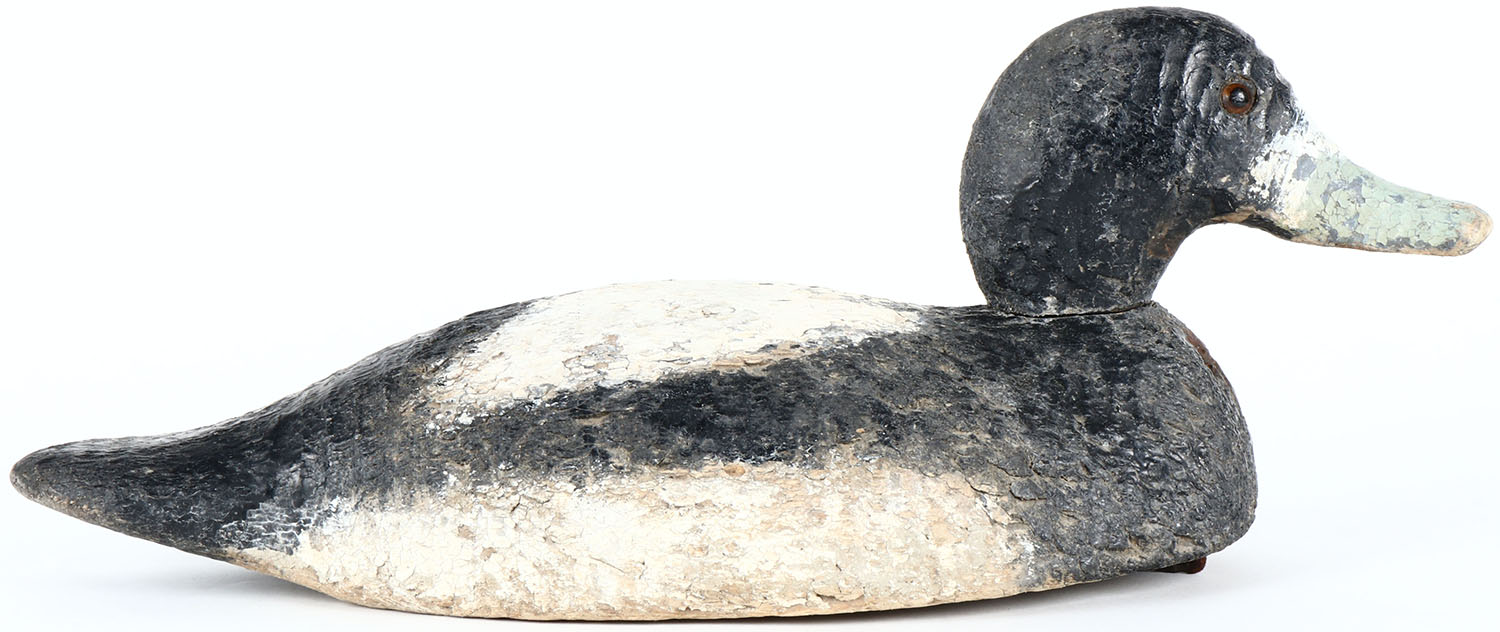 Bluebill Drake by a Pascagoula, MS factory, glass eyes, solid wood, old hunter repaint, structurally excellent. Grade: Very Good - Value: 20 to 40