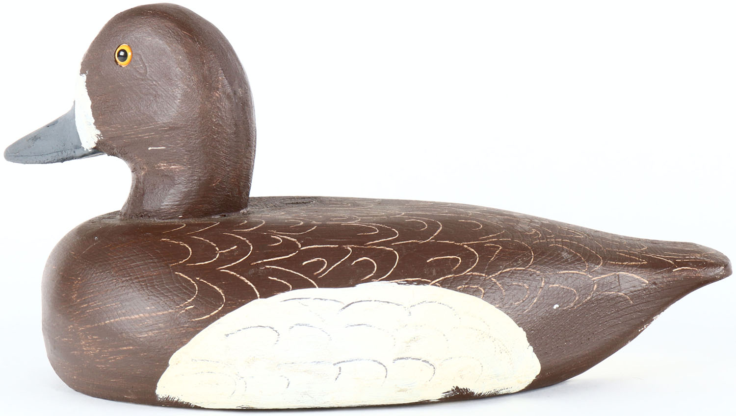 Bluebill Hen by Archie Cameron, Kingston, Ontario, Canada, glass eyes, solid wood, original paint, structurally excellent, stamped by maker on bottom. Grade: Excellent - Value: 40 to 80