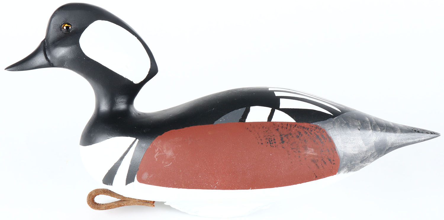Hooded Merganser by unknown maker, glass eyes, solid wood, original paint, structurally excellent. Grade: MINT - Value: 30 to 60