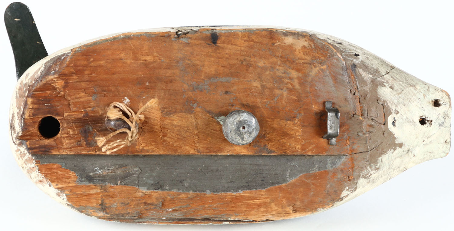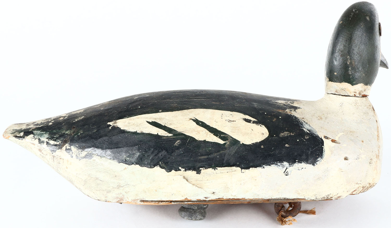 Goldeneye Drake by unknown maker, tack eyes, solid wood, old hunter repaint, has age cracks on body. Grade: Very Good + - Value: 30 to 60