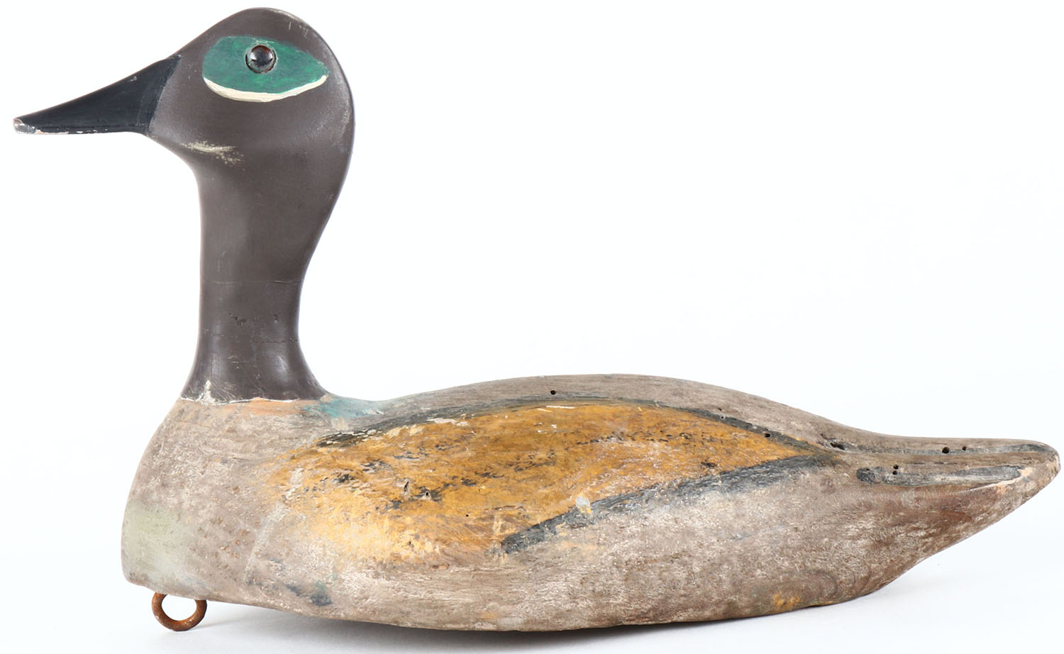 Green Wing Teal Drake by unknown Spanish maker, glass eyes, solid wood, original paint, structurally excellent. Grade: Excellent