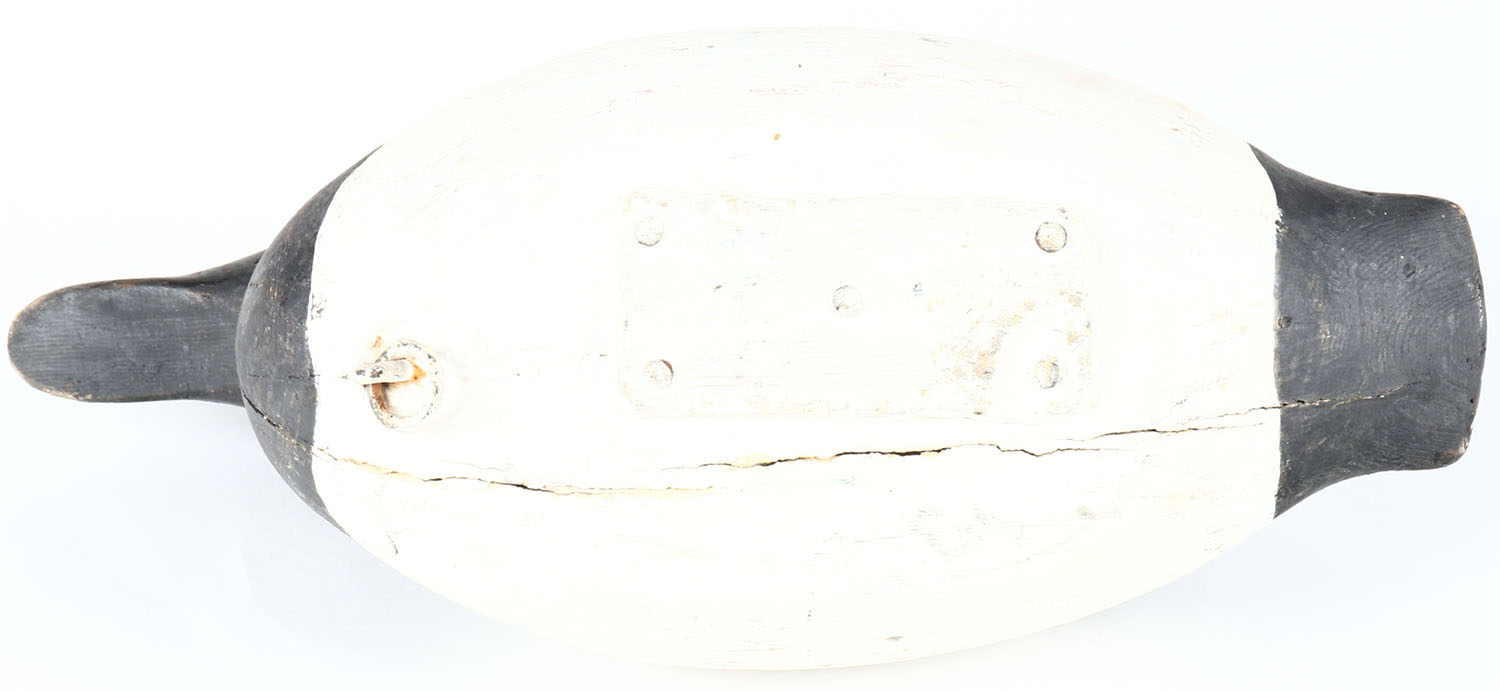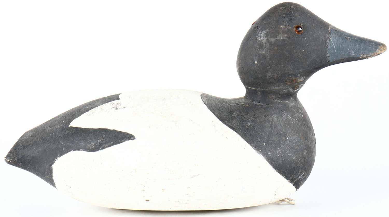 Bluebill Drake by Padco, Pascagoula, MS, glass eyes, solid wood, old hunter working repaint, has age cracks on bottom. Grade: Very Good ++ - Value: 20 to 40