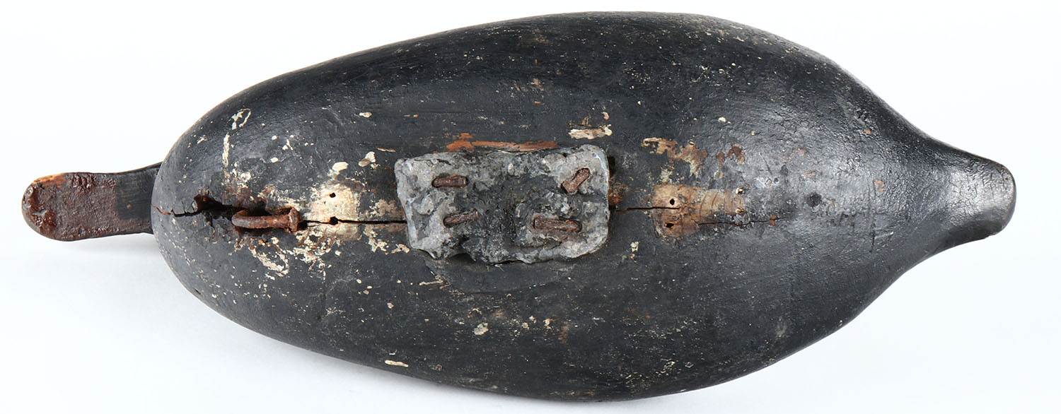 Scoter by unknown New England maker, painted eyes, solid wood, combination of original and hunter working touch-up, has age cracks on bottom, head has chips in it. Grade: Very Good + - Value: 80 to 150