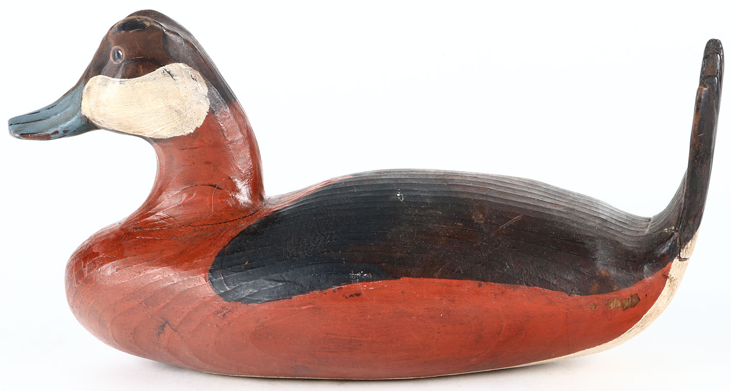 Ruddy Duck Drake by Rick Moes, painted eyes, solid wood, original paint, structurally excellent, signed on bottom. Grade: Excellent ++ - Value: 30 to 60
